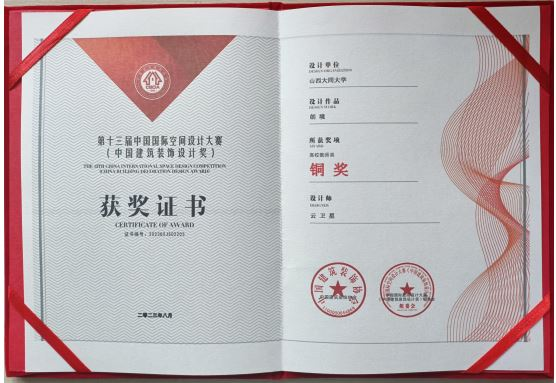 近日,第十三屆中國國際空間設計大賽暨中國建筑裝飾設計獎揭曉,我校美術學院環境設計專業副教授云衛星老師的作品《朗境》在全國同類作品中脫穎而出,榮獲年度銅獎。