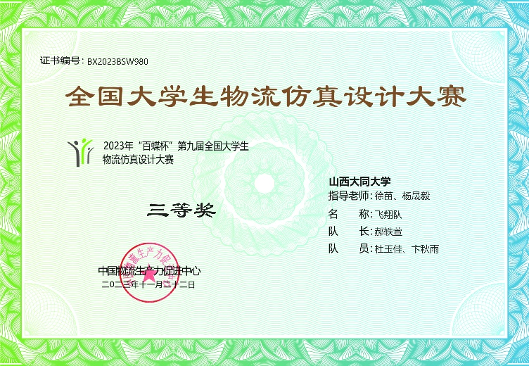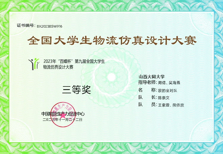 由中國物流生產力促進中心主辦、上海百蝶教育科技有限公司承辦、中國供應鏈產教聯(lián)盟協(xié)辦的第九屆全國大學生物流仿真設計大賽于2023年11月20日落下帷幕。商學院物流管理專業(yè)學生積極參加,由22級物流管理專業(yè)學生組建的2支隊伍在4位老師的指導下均取得全國三等獎的佳績。