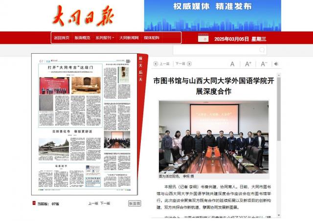 本報訊(記者 李炯)書香共建,協同育人。日前,大同市圖書館與山西大同大學外國語學院共建深度合作座談會在市圖書館舉行。此次座談會聚焦雙方既有合作的延續拓展以及新項目的創新構建,雙方共探合作新航道,擘畫協同發展新圖景。