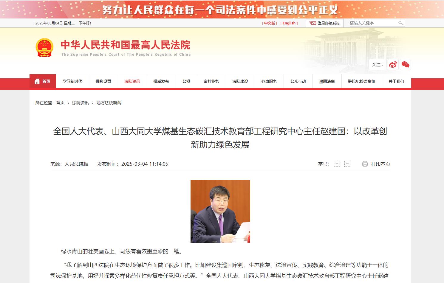 3月6日,中華人民共和國最高人民法院官網、《人民法院報》推出專題報道《全國人大代表、山西大同大學煤基生態碳匯技術教育部工程研究中心主任趙建國:以改革創新助力綠色發展》,趙建國表示,希望通過科技賦能司法,織牢織密生態環境保護網,一體推動山西“四山”“兩河”、長城、石窟生態環境保護,在守護美麗大同、美麗山西上充分展現全國人大代表的擔當作為。