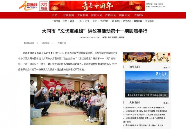 黃河新聞網大同訊(記者 安青)3月16日,由山西大同大學外國語學院、山西大同大學國際交流中心以及大同市圖書館(大同市少兒圖書館)聯合主辦的“‘忘憂寶姐姐’講故事——‘英’你精彩,‘語’你同行”(第十一期)在大同市圖書館陶吧成功舉辦。此次活動特別邀請外教Maj,為27組親子家庭打造了一場兼具文化深度與語言趣味的沉浸式學習體驗。