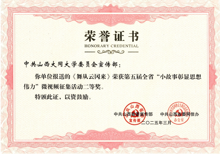 3月17日,第五屆全省理論宣講大賽小故事彰顯思想偉力微視頻征集活動頒獎儀式在太原舉行。由我校黨委宣傳部統籌策劃,并與新聞與傳媒學院、音樂學院聯合創作的原創作品《舞從云岡來》從全省數百部作品中脫穎而出,榮獲二等獎并成為全省高校唯一獲二等獎作品,代表高校亮相頒獎儀式。