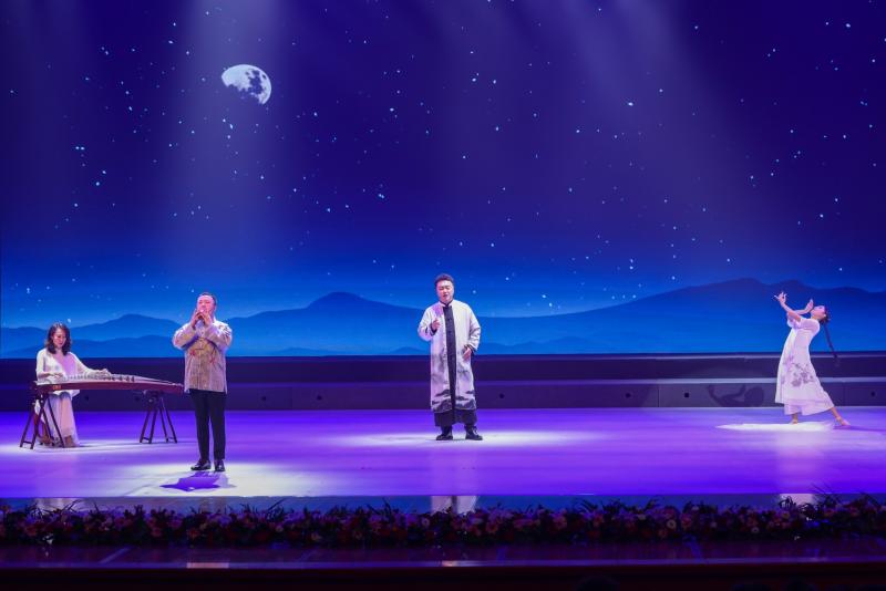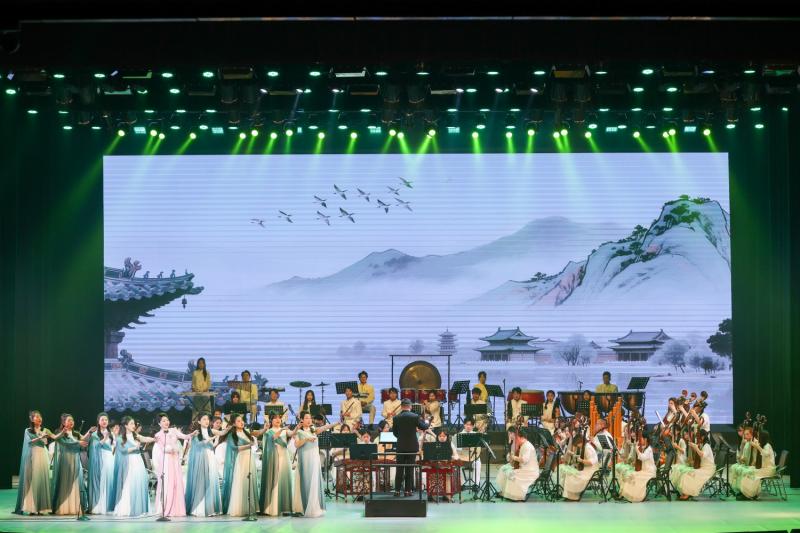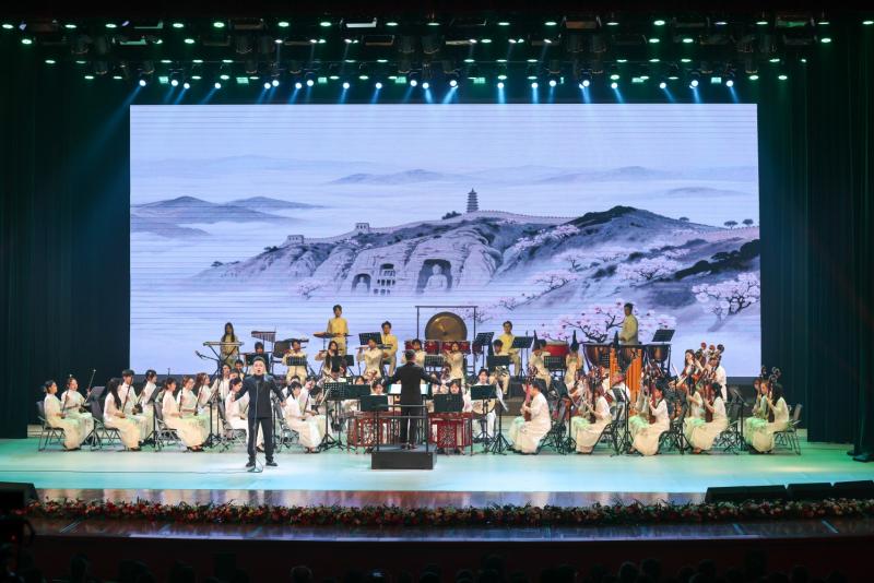 展演共包含14個節(jié)目,上半場6首云岡詩歌,是山西省首屆藝術(shù)基金資助項(xiàng)目“云岡石窟詩詞民族管弦樂”的部分成果,均為首次亮相的原創(chuàng)歌曲,伴奏樂隊由音樂學(xué)院近80名民樂專業(yè)的師生組成。男中音獨(dú)唱《云中天工》、女高音獨(dú)唱《滿江紅》、女高音獨(dú)唱《佛閣梵境》、女高音獨(dú)唱《石破禪吟》、女聲小合唱《暢游云岡》、女高音獨(dú)唱《重九懷鄉(xiāng)》,吟唱著名學(xué)者、文人與云岡石窟的動人故事,回望云岡石窟承載的歷史記憶。