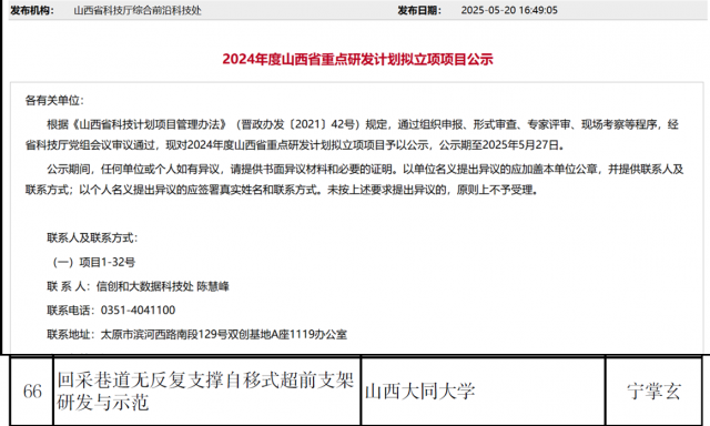 5月20日,山西省科學(xué)技術(shù)廳發(fā)布了“2024年度山西省重點(diǎn)研發(fā)計(jì)劃擬立項(xiàng)項(xiàng)目公示”,我校二級(jí)教授寧掌玄主持的“回采巷道無(wú)反復(fù)支撐自移式超前支架研發(fā)與示范”項(xiàng)目獲批立項(xiàng),這是我校近五年來(lái)獲批的第二項(xiàng)省重點(diǎn)研發(fā)。