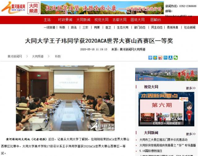 黃河新聞網大同訊(記者胡雁)近日,記者從大同大學了解到,在剛剛結束的ACA世界大賽山西賽區比賽中,大同大學美術學院17級設計系王子瑋同學喜獲2020ACA世界大賽山西賽區一等獎。