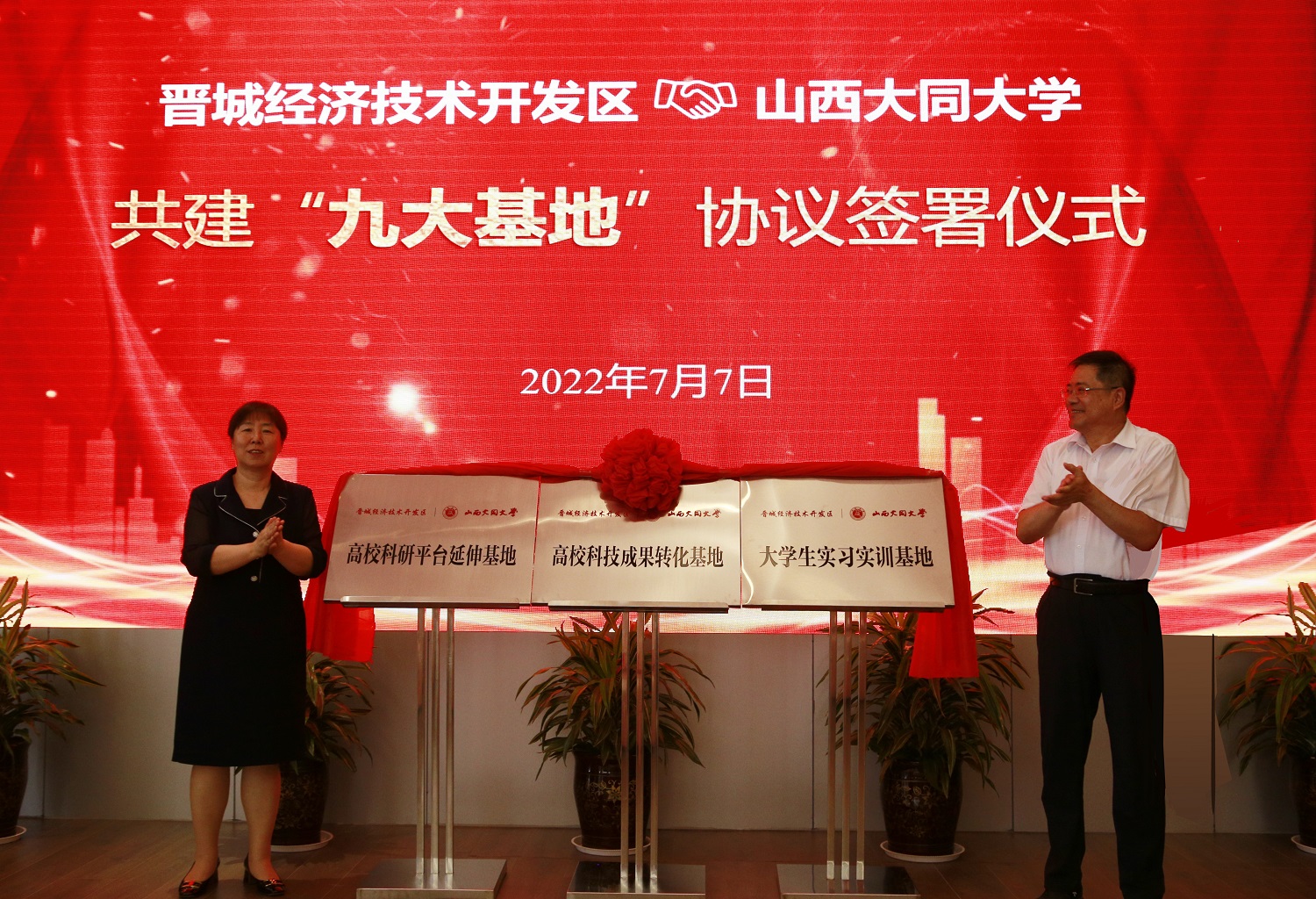 季夏六月,時暑赫晞;校區(qū)聯(lián)手,共結(jié)華實。7月7日,山西大同大學與晉城經(jīng)濟技術(shù)開發(fā)區(qū)合作共建“九大基地”協(xié)議簽署暨揭牌儀式在山西晉城智創(chuàng)城隆重舉行。這是雙方貫徹落實習近平總書記視察山西重要講話重要指示精神的重大舉措,是雙方落實省第十二次黨代會精神的具體行動,是雙方高度重視人才戰(zhàn)略和科技創(chuàng)新的具體體現(xiàn),是山西大同大學堅持“轉(zhuǎn)型發(fā)展、內(nèi)涵發(fā)展、特色發(fā)展、質(zhì)量立?!薄⑴ㄔO(shè)高水平應用型綜合大學的生動實踐。