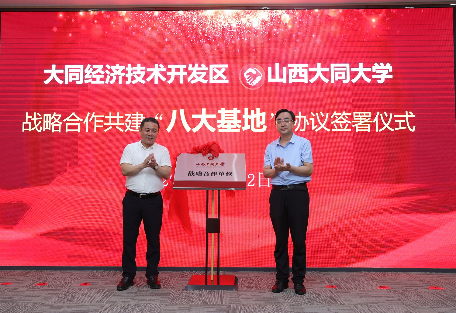 我校授予大同經濟技術開發區戰略合作單位。趙水民與趙學斌共同為其揭牌。