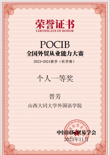 11月2日到11月14日,為期12天的第十三屆POCIB全國(guó)外貿(mào)從業(yè)能力大賽落下帷幕。本次大賽由中國(guó)國(guó)際貿(mào)易學(xué)會(huì)主辦,共有來(lái)自全國(guó)的1059支團(tuán)隊(duì)參賽,參賽選手總數(shù)10590人。我校外院商務(wù)英語(yǔ)10位同學(xué)在教師王金花和陳紅濤的精心指導(dǎo)下,榮獲本次大賽本科組團(tuán)體二等獎(jiǎng),其中晉芳同學(xué)榮獲個(gè)人一等獎(jiǎng),郭晨瑞、王浩宇、支建婉和祝子靜同學(xué)榮獲個(gè)人三等獎(jiǎng)。
