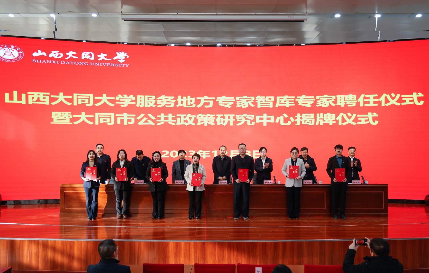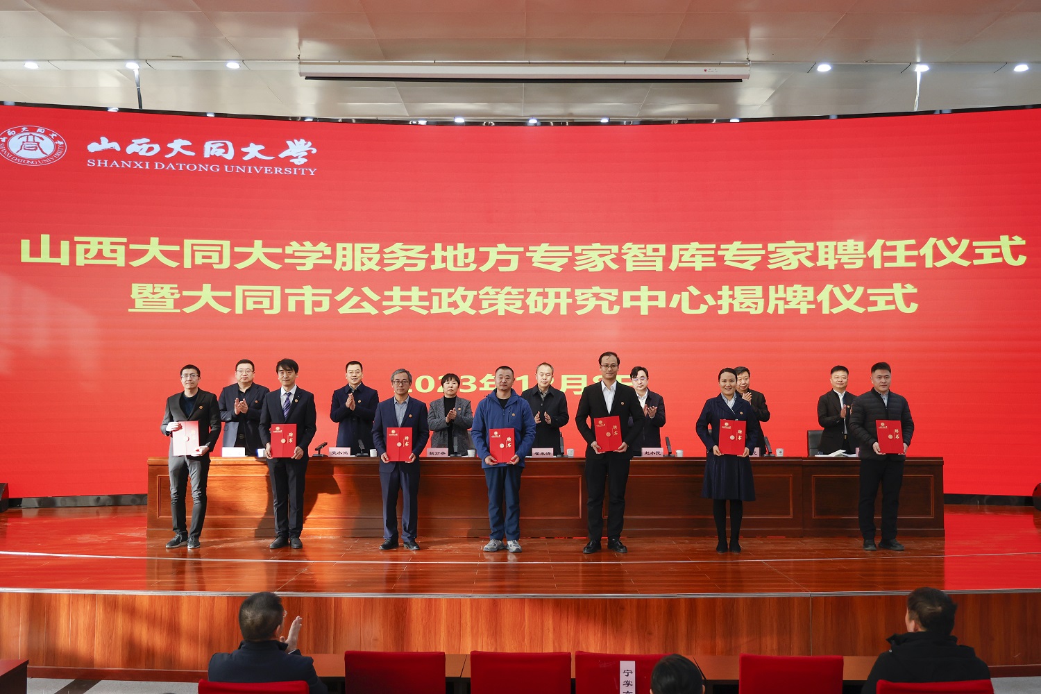 與會領導為山西大同大學服務地方專家智庫專家代表頒發聘書。
