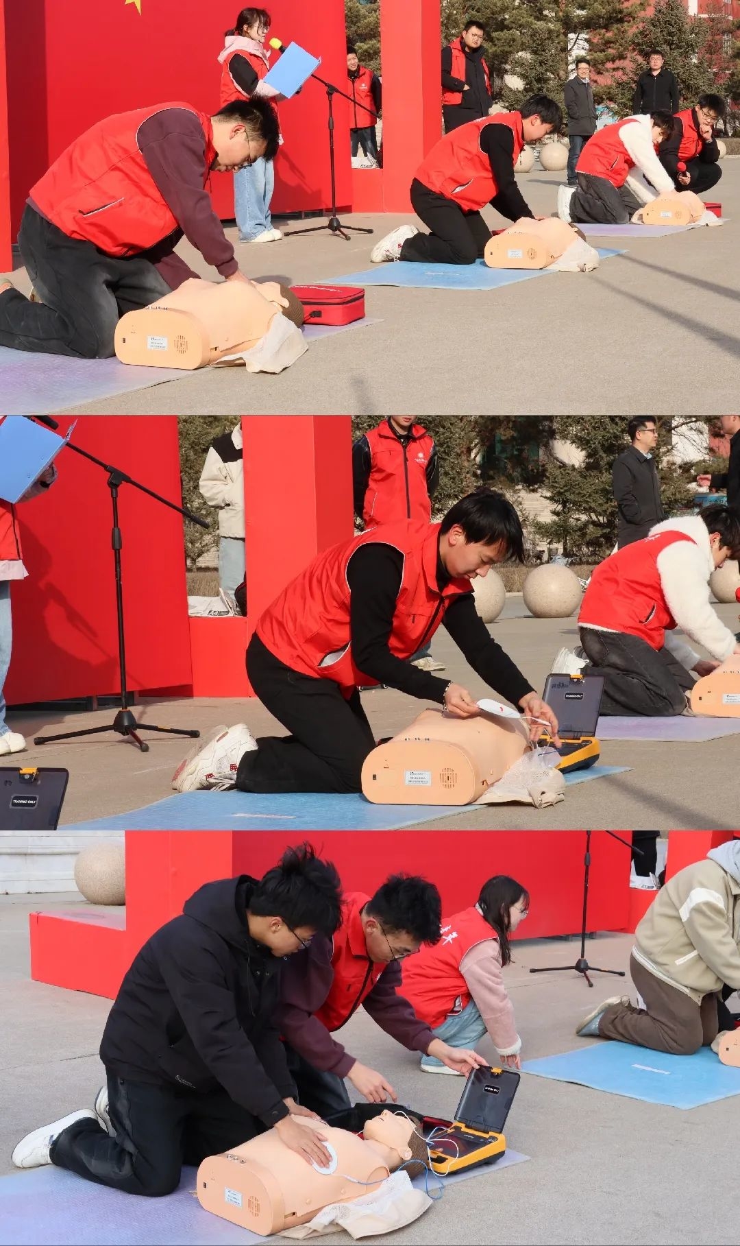 活動當天,山西大同大學紅十字會學生分會在啟動儀式會場進行了“雷鋒精神映校園心肺復蘇護生命”心肺復蘇展演教學。工作人員通過詳細講解和標準示范,向在場師生傳授心肺復蘇的關鍵步驟和操作要點。教學結束后,工作人員還邀請老師與同學們上臺進行互動學習,親身體驗,深入講解了心肺復蘇的關鍵步驟和操作要點。
