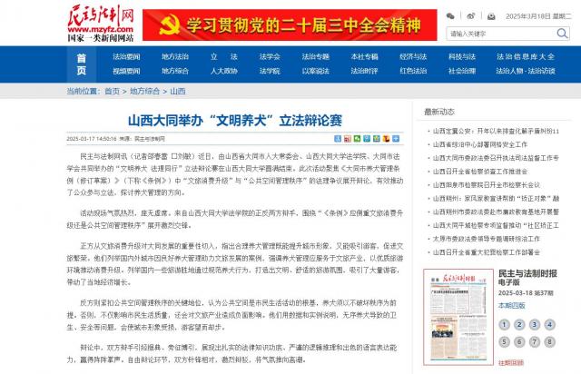 民主與法制網訊(記者 邵春雷 劉敏)近日,由山西省大同市人大常委會、山西大同大學法學院、大同市法學會共同舉辦的“文明養犬法理同行”立法辯論賽在山西大同大學圓滿結束。此次活動聚焦《大同市養犬管理條例(修訂草案)》(下稱《條例》)中“文旅消費升級”與“公共空間管理秩序”的法理爭議展開辯論,有效推動了公眾參與立法,探討養犬管理的方向。