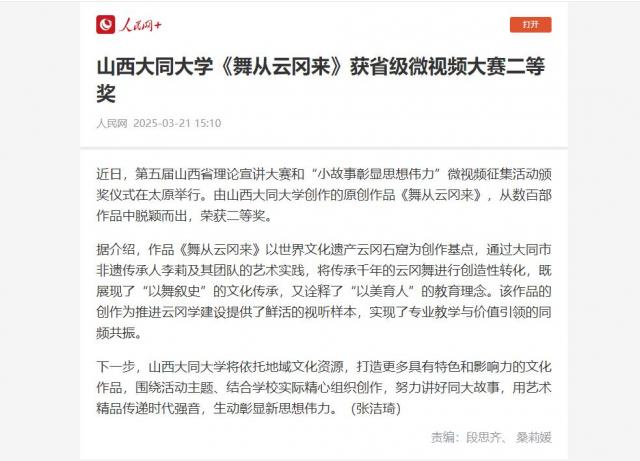 近日,第五屆山西省理論宣講大賽和“小故事彰顯思想偉力”微視頻征集活動(dòng)頒獎(jiǎng)儀式在太原舉行。由山西大同大學(xué)創(chuàng)作的原創(chuàng)作品《舞從云岡來(lái)》,從數(shù)百部作品中脫穎而出,榮獲二等獎(jiǎng)。