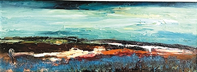 漫步展廳,猶如打開一扇通往奇幻之境的藝術之門。展出的50幅油畫作品,均是他極富藝術功力的精品力作。小幅油畫,展現的是王榮內心深處的大世界。《故土東韻》《湖光山色》《大地印象》《歲月留痕》《厚土情深》《云壑清心》《故山秋韻》《隴原秋色》《暖日和風》《殘雪無語》《寂靜高原》《雪域高原》《靜觀八荒》《守望高原》等作品在王榮的筆下掙脫具象的羈絆,于畫布之上以油彩為詩,書寫內心的宇宙。觀其作品,筆觸縱橫捭闔,色彩沖撞交融,似是塞外長風呼嘯著卷過古城墻,又仿若晨光穿透云岡的薄霧,混沌中綻出明晰,無序里隱現規律。有時,數筆厚重油彩堆疊,仿若恒山峻嶺的雄渾氣魄;轉瞬,輕薄顏料的肆意流淌,又勾勒出文瀛湖的瀲滟柔波。王榮用藝術的“煉金術”,將眼中實景提純為心中幻景。每一幅作品都蘊含著他對生命、時光和美的思索,讓觀者在欣賞風景的同時也不禁陷入對生活本真的思考。