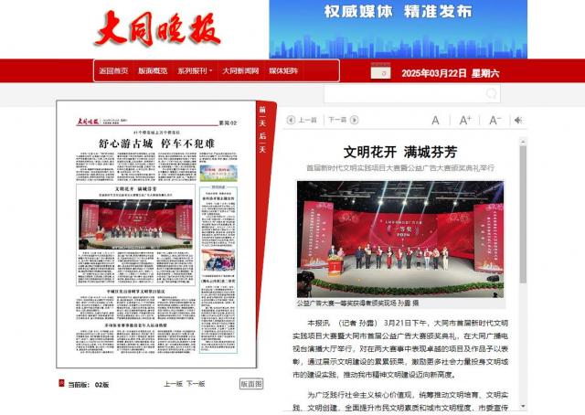 在大同市首屆新時代文明實踐項目大賽中,經各縣區和市直相關部門逐級推薦、專家評審等程序,最終評選出49個優秀項目和9個優秀組織單位,其中一等獎3個、二等獎5個、三等獎10個、優秀獎31個。在大同市首屆公益廣告大賽中,經過專家多輪評審,最終評選出120件優秀作品和18個優秀組織單位,其中一等獎作品9件、二等獎19件、三等獎32件、優秀獎60件。